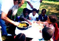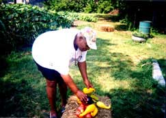 | The garden is dormant as of this writing. The garden is to be enlarged so we will need to get more compost and fertilizer for the new areas and fertilizer for the rest. We are going to invest in soaker hoses and tools for the kids. I have been attending other Troostwood Youth events as I can to help, so I can understand the community better, and get better acquainted with the kids. At right, Marty dishes up crookneck squash for snack and the kids ask for seconds. They grew them, after all. |