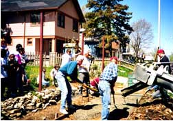 | At left, Tracy Gardens gardners having fun showing off their fall green bean harvest. At right, Volunteers from Country Club Christian Church pour the front sidewalk at Trach Gardens whike kids watch. | ||||||||||