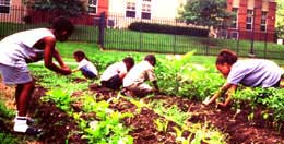 | Here the Troostwood kids weed the garden. Rockhurst residences can be seen in the background. | ||||||||||